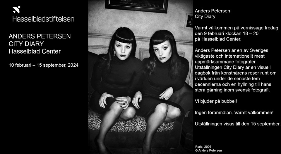 Varmt välkommen på vernissage fredag den 9 februari klockan 18 – 20 på Hasselblad Center. Anders Petersen är en av Sveriges viktigaste och internationellt mest uppmärksammade fotografer. Utställningen City Diary är en visuell dagbok från konstnärens resor runt om i världen under de senaste fem decennierna och en hyllning till hans stora gärning inom svensk fotografi. Vi bjuder på bubbel! Ingen föranmälan. Varmt välkommen! Utställningen visas till den 15 september. FK PAN Göteborg 5 jan 2024 0kommentarer